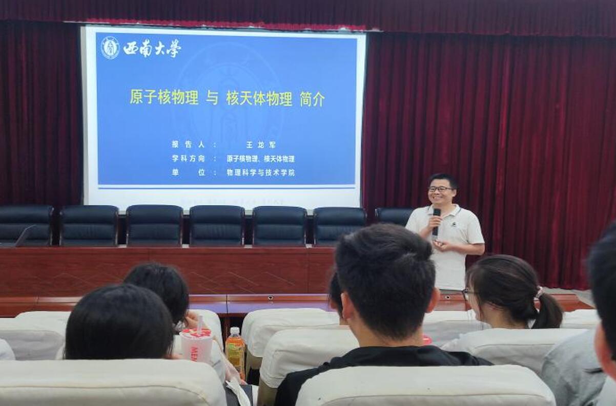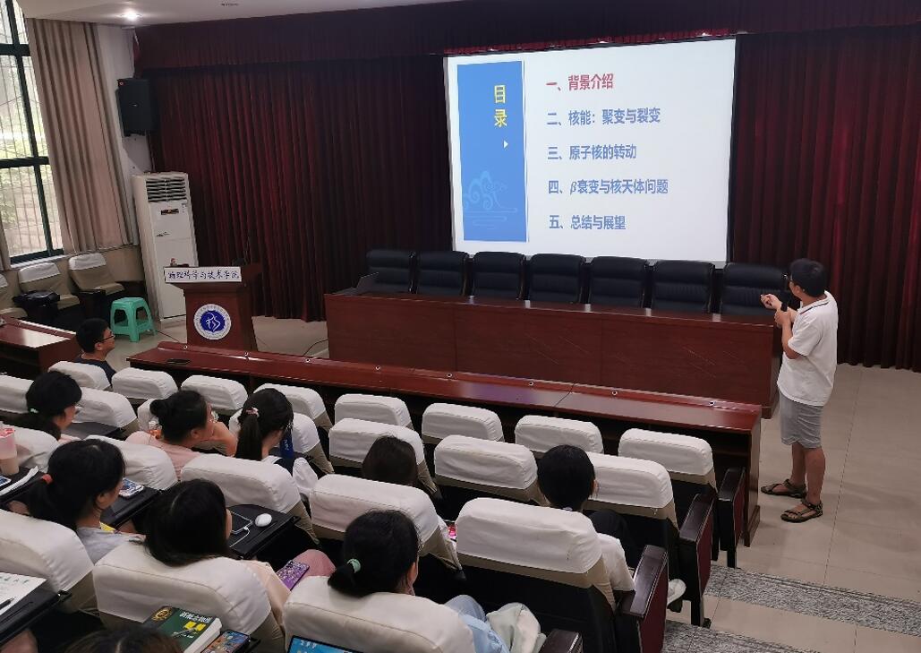 6月8日,第十二期悟理论坛在物理大楼小阶梯教室举行,2021级物理学2班承办此次论坛。本期论坛的主题是“原子核物理与核天体物理简介”,王龙军副教授应邀担任主讲嘉宾,副院长桑文龙、91成人社区 团委书记贺颖老师参会。