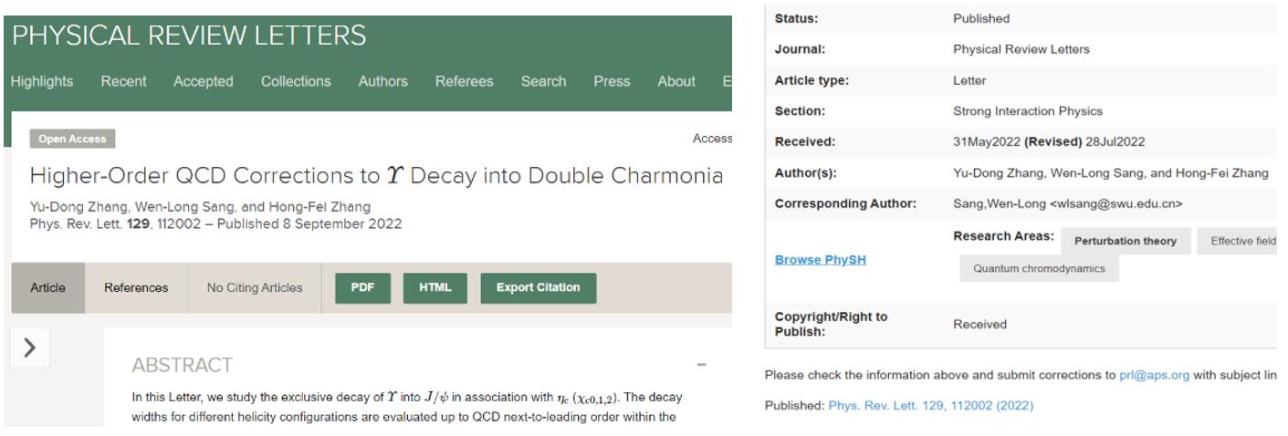 近日91成人社区强子物理团队桑文龙教授与研究生张余栋同学及贵州财经大学的张鸿飞老师在物理学顶级期刊《物理评论快报》(PRL)上发表题为“Higher-order QCD corrections to Upsilon decay into double charmonia”的科研工作,91成人社区 为该成果的第一及唯一通讯作者完成单位,其中张余栋同学为第一作者,桑文龙老师为唯一通讯作者。该研究工作得到了国家自然科学基金面上基金资助。